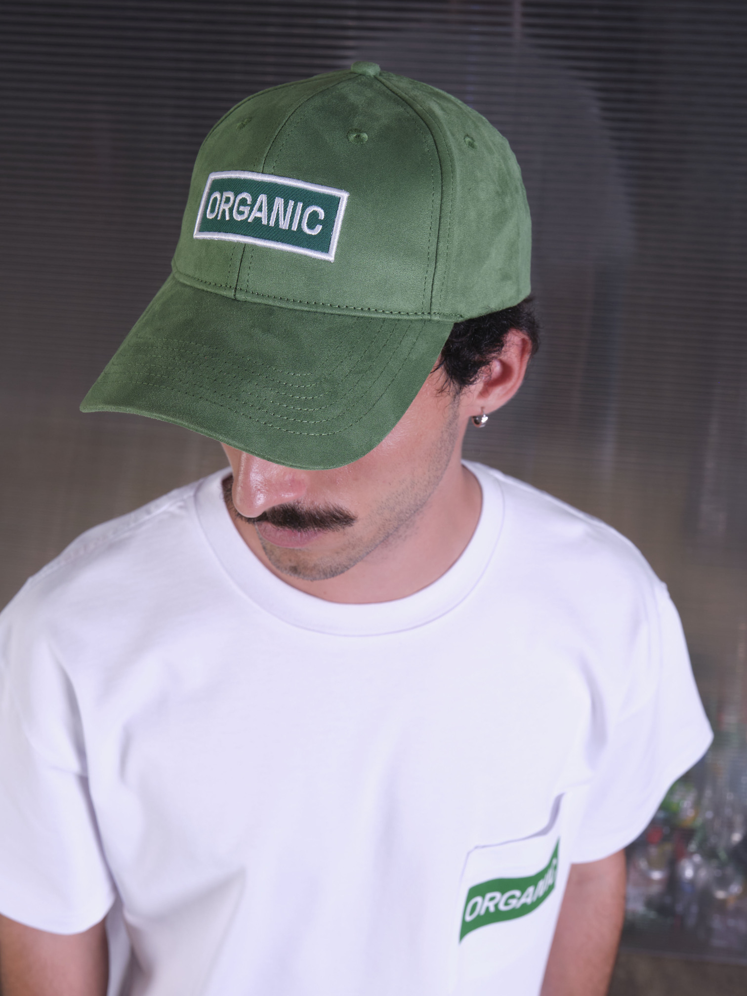 A green eco-suede cap with embroidered contrasting logos is the perfect finishing touch for every day.