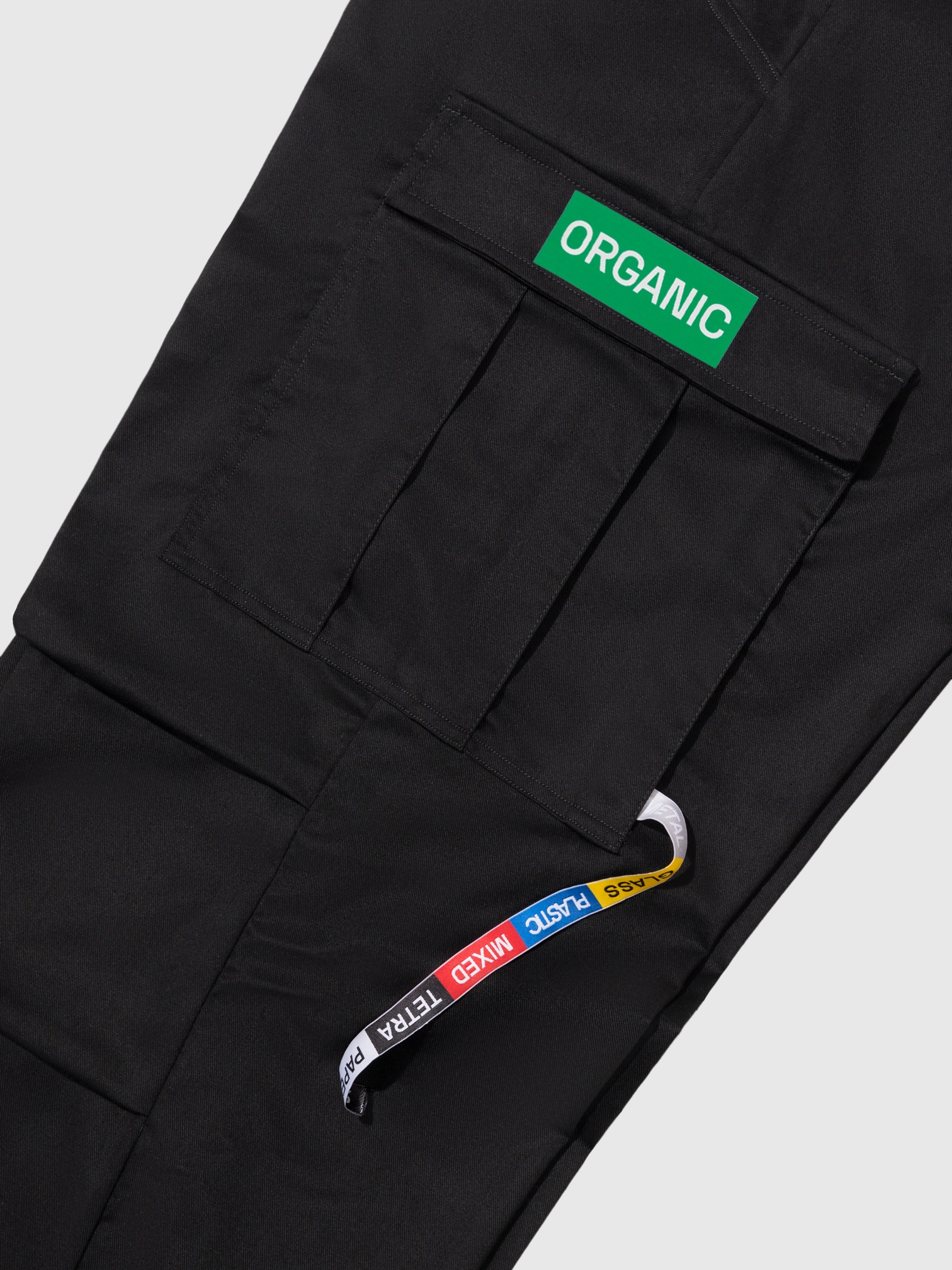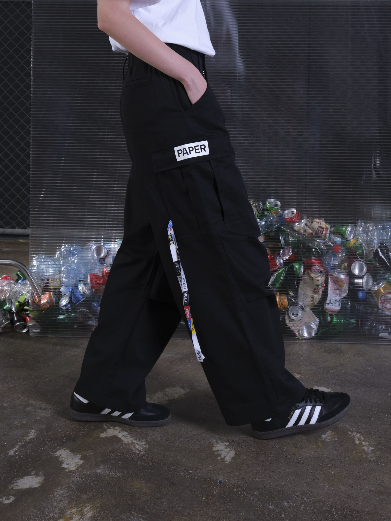 Relaxed-fit black cotton cargo pants with trash stamps on the side pockets and babp laces.